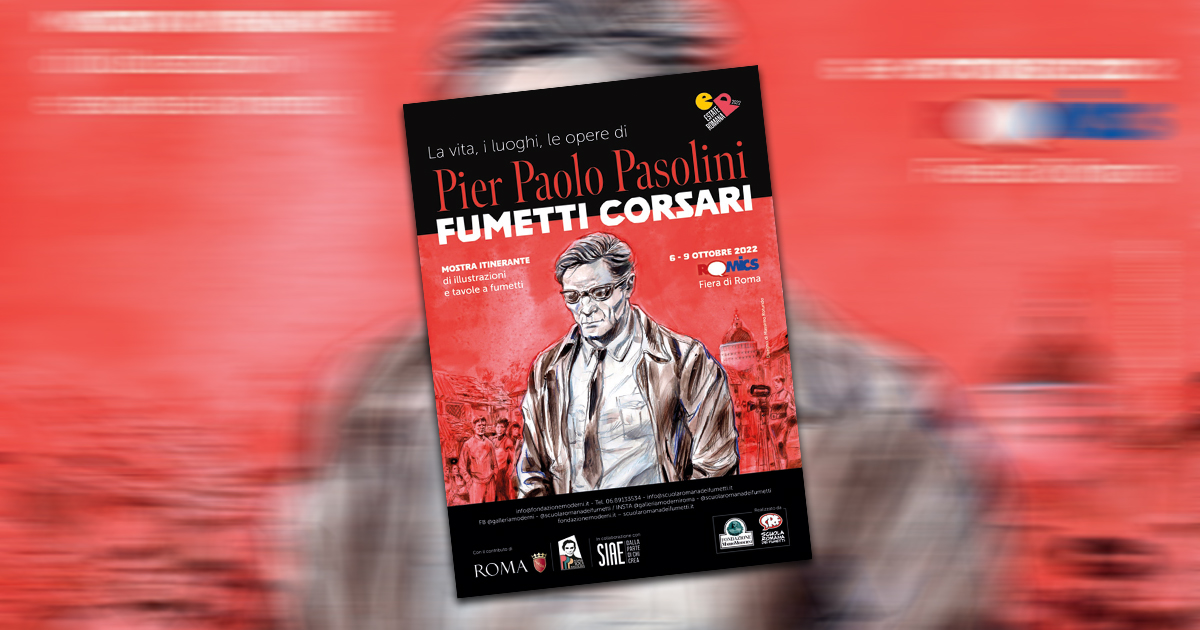 Arriva a Romics la mostra "FUMETTI CORSARI La vita, i luoghi, le opere di PIER PAOLO PASOLINI", curata dalla Fondazione Mario Moderni e dalla Scuola Romana dei Fumetti, che sono liete di presentare un’esposizione di 30 opere originali, tra illustrazioni e tavole a fumetti realizzate appositamente da disegnatori professionisti, tra cui STEFANO CASELLI (Spider-man), ARIANNA REA (Disney), ROBERTO RECCHIONI (curatore di Dylan Dog). Dalla letteratura al cinema, dal teatro alla poesia, il patrimonio culturale di Pasolini rivive nella contemporaneità attraverso le interpretazioni in mostra, ad opera di: